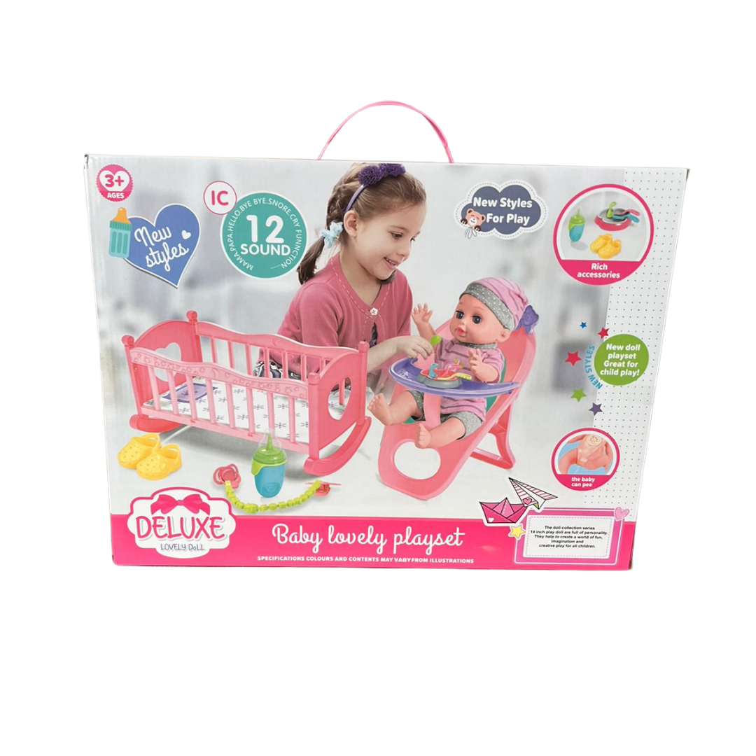 El set incluye una muñeca bebé, una cuna mecedora, una silla alta para comer, y 12 accesorios adicionales como un biberón y un chupete.