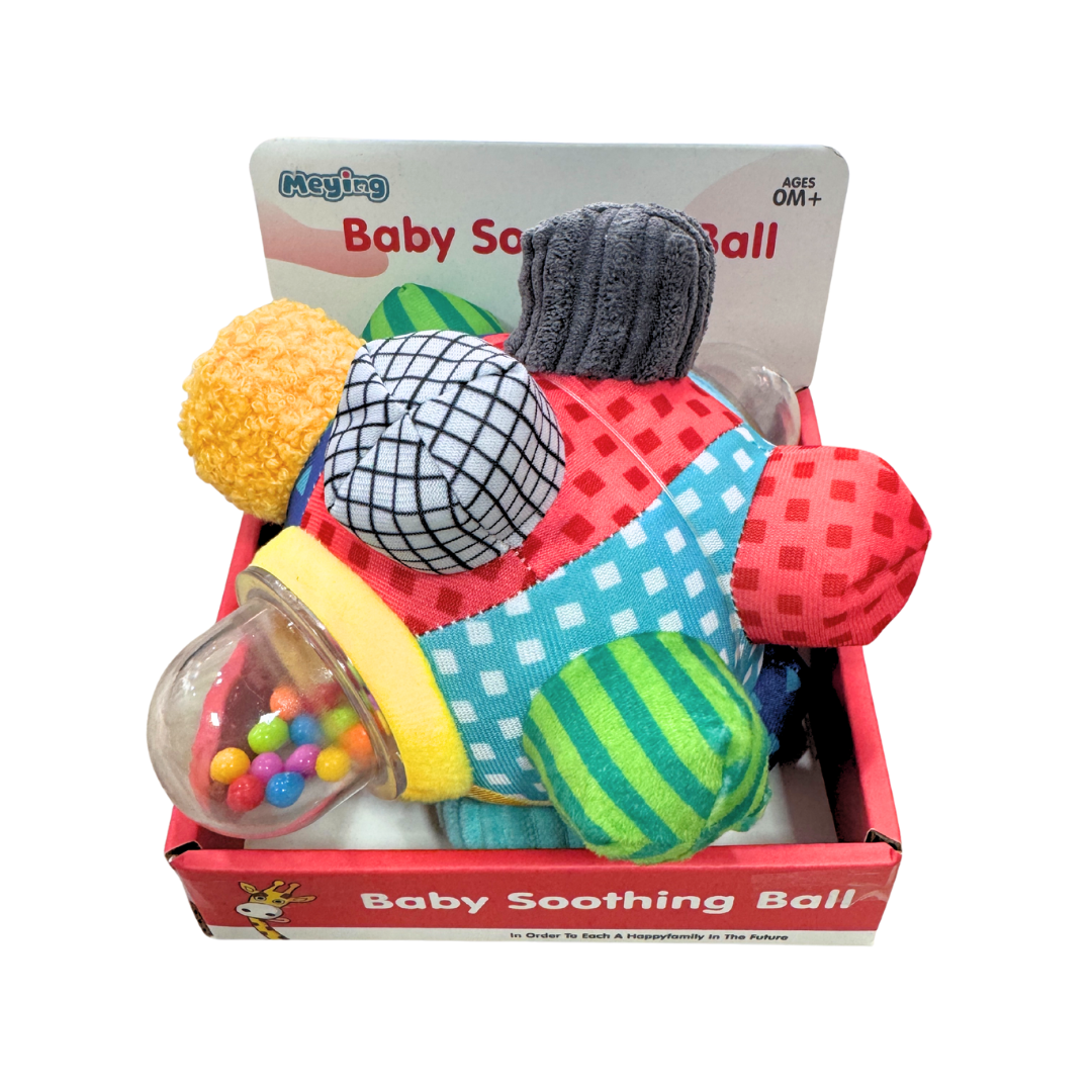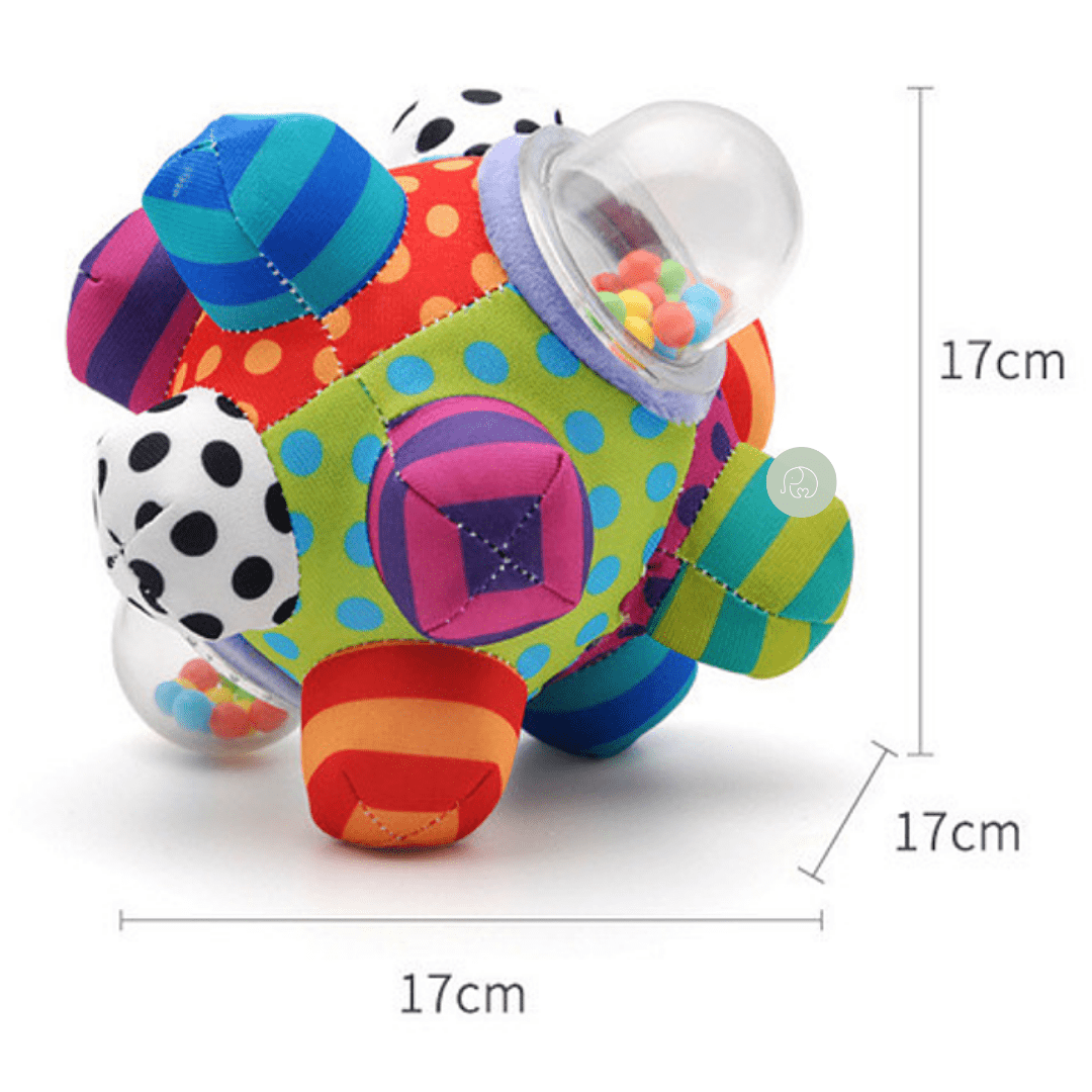 - Diseño: Es una pelota blanda y multicolor, con diferentes texturas y patrones llamativos para captar la atención del bebé.